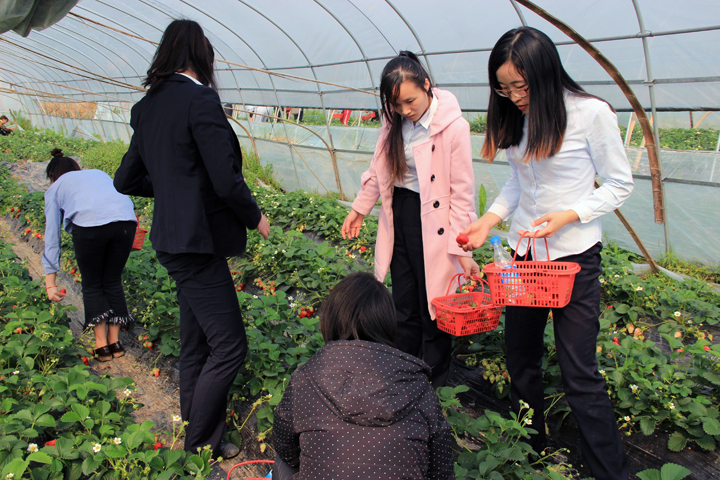 平日里我們總吃著菜市場、超市買來草莓,今天我們來一場身體力行的摘草莓。一行人分成五組進入到不同的采摘棚內(nèi),穿上鞋套,提起籃子,擼起袖子加油摘。挑選、采摘,每個人甄別的方式都有些區(qū)別。有的喜歡個頭小,認為是精華,專挑小小的紅瑪瑙;有的說個頭大是珍品,專挑誘人的巨無霸。倘若看中同一顆,那就是時候來一場手速的比拼了。好吃不怕量大,摘莓不怕腰酸,平日久坐的女同事們此時都是身手矯捷,采摘棚內(nèi)輾轉(zhuǎn)騰挪,頗有女俠風范。