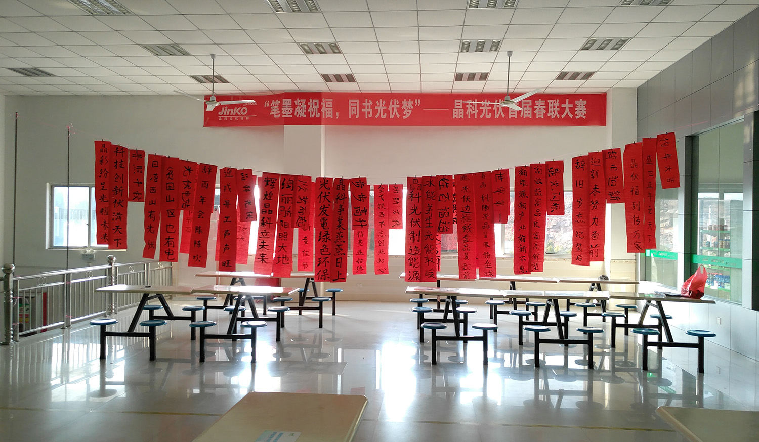 2018年2月8日,主題為“筆墨凝祝福,同書光伏夢”的晶科光伏首屆春聯大賽于食堂二樓舉行。二十余位來自各部門、各車間的“書法家”揮毫潑墨,為晶科光伏送上了2018年美好的祝愿。本次活動旨在為員工提供一個展示吉祥祝福話語的平臺,為員工提供一個表現個人才華風采的機會,同時豐富員工的業(yè)余文化生活。