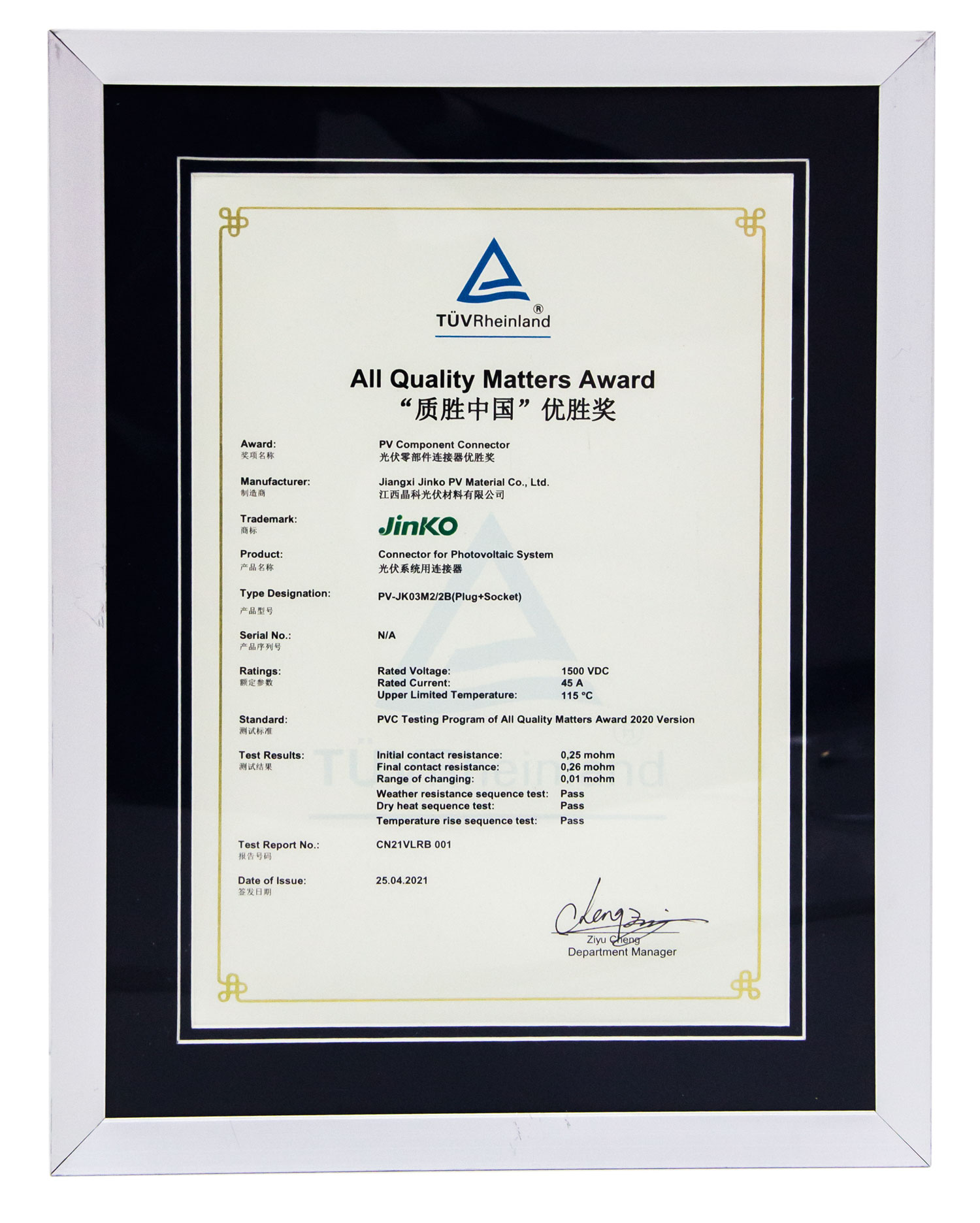4月28日,TüV萊茵第七屆“質(zhì)勝中國”光伏盛典暨“質(zhì)勝中國優(yōu)勝獎”頒獎典禮在杭州西溪喜來登度假大酒店隆重舉行。晶科光伏憑借JK-03M2連接器在大電流環(huán)境穩(wěn)定可靠的運行能力,在眾多競爭者中脫穎而出,繼2019年后再次斬獲“光伏零部件連接器優(yōu)勝獎“