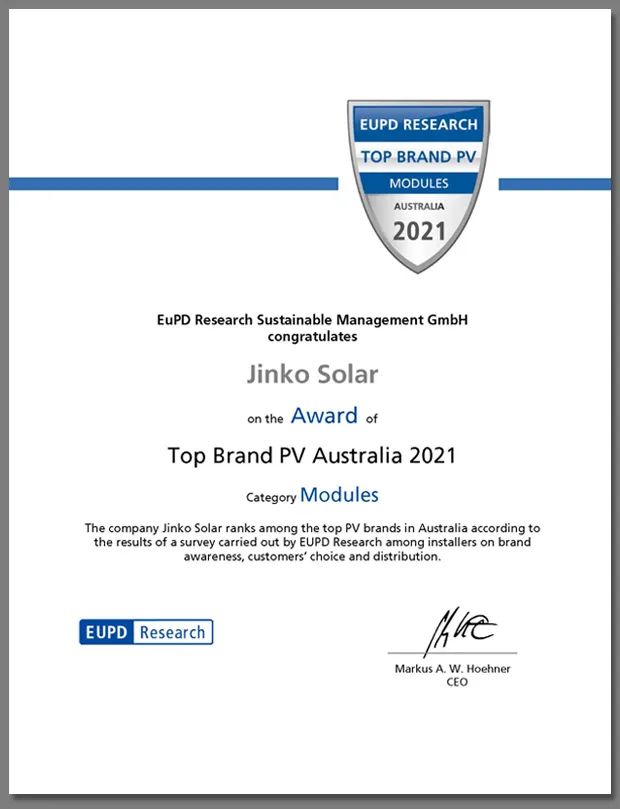 晶科能源榮獲由EuPD Research頒發(fā)的澳大利亞2021年度“頂級光伏品牌”獎